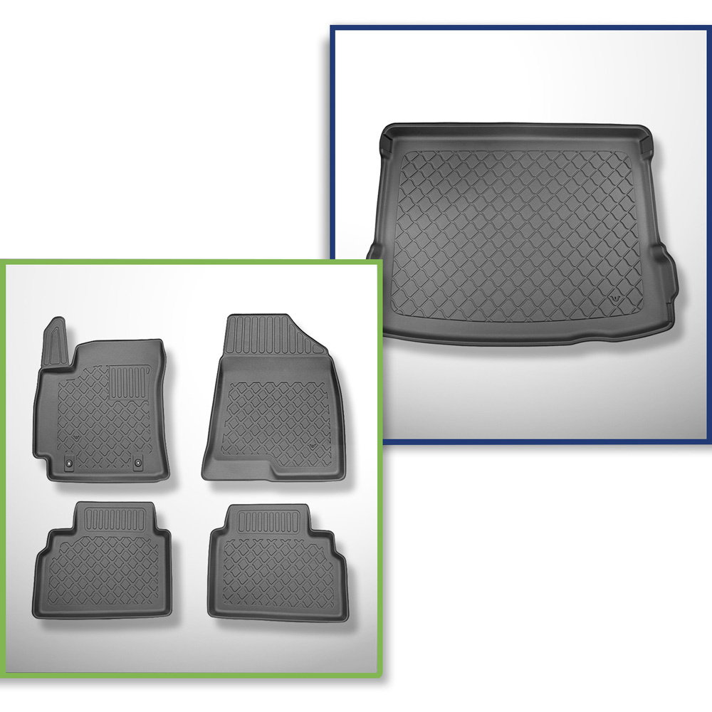 Sada rohož do zavazadlového prostoru a autokoberečky TPE na míru do: Hyundai Kona II SUV (04.2023-....) - horní zavazadlový prostor; pohyblivá podlaha v nejvyšší poloze; s i bez subwooferu; ne pro elektrickou verzi; rovněž s hybridním pohonem