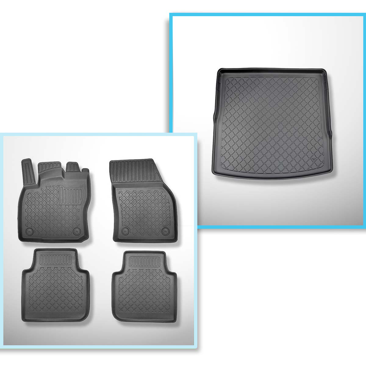 Sada rohož do zavazadlového prostoru a autokoberečky TPE na míru do: Volkswagen Tiguan Allspace SUV (11.2017-10.2023) - 5 míst na horní zavazadlový prostor; typy s pohyblivou podlahou zavazadlového prostoru / 7 míst; 3. řada snížená