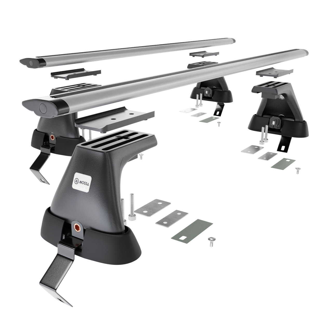- Základní střešní nosič se skládá ze 2 pevných hliníkových nosníků a 4 držáků (tzv. patek) <